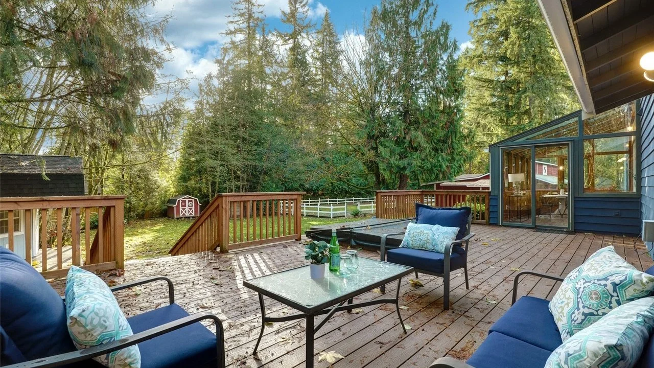 A gorgeous equestrian sanctuary in peaceful Cottage Lake Bridle Estates. The stately brick entrance welcomes you to a warm and inviting, fully updated home on more than two pastoral acres. Main floor offers beautiful hand scraped hardwoods, an expansive and spacious chef’s kitchen with quartz countertops, stainless steel appliances, a charming sunroom/dining nook, and a formal living and dining room. The oversized rec room with separate entry and the office/media room offer potential MIL addition. On the upper level you’ll find a welcoming office nook, a full bath, and four bedrooms including a primary suite with a stunning new spa-like bathroom. Outside is an adorable four stall barn with paddocks, 130x60 outdoor arena and lovely pastures. The oversized deck is perfect for entertaining with a hot tub, patio, fire pit, and a darling playhouse. The house features A/C, a three-car garage with EV charger, and RV or trailer parking. Enjoy country living close to Woodinville, wineries, coveted Northshore Schools and easy access to 522. Come home to Cottage Lake.