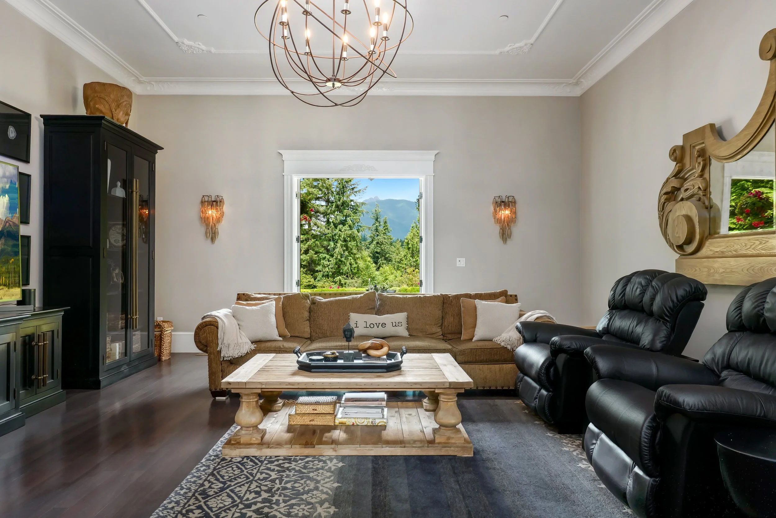 The opulent chef’s kitchen blends luxury and warmth, featuring dual refrigerators, a farmhouse sink, quartzite countertops, a walk-in pantry, and a Thermador gas range. A large island, walk-in pantry, wine and beverage fridges, and built-in trash compactor make entertaining easy. The bright breakfast area opens to a covered patio with Mount Si views, enhanced by crystal chandeliers and under-cabinet lighting.