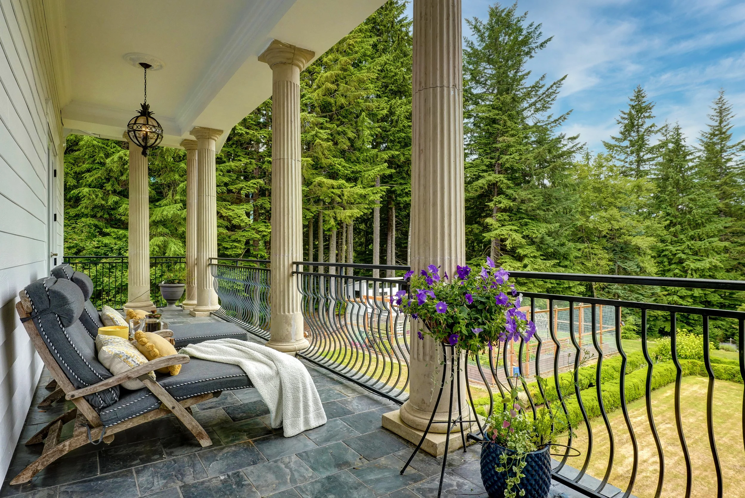 Gently nestled in a gated community and just off the beaten path, The Lavender House at Edgewick blends refined design with Pacific Northwest beauty. A stone fountain leads to grand glass-and-iron doors opening to an entryway with dual marble staircases and custom ironwork. The formal living room opens through French doors to a covered patio with peaceful views, while the formal dining room impresses with wood-beamed ceilings and marble floors—ideal for entertaining.